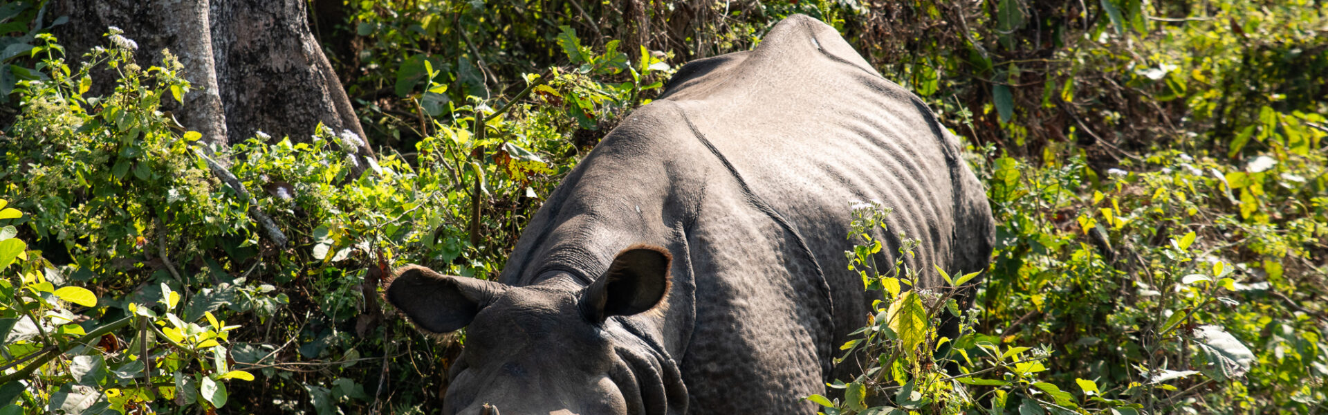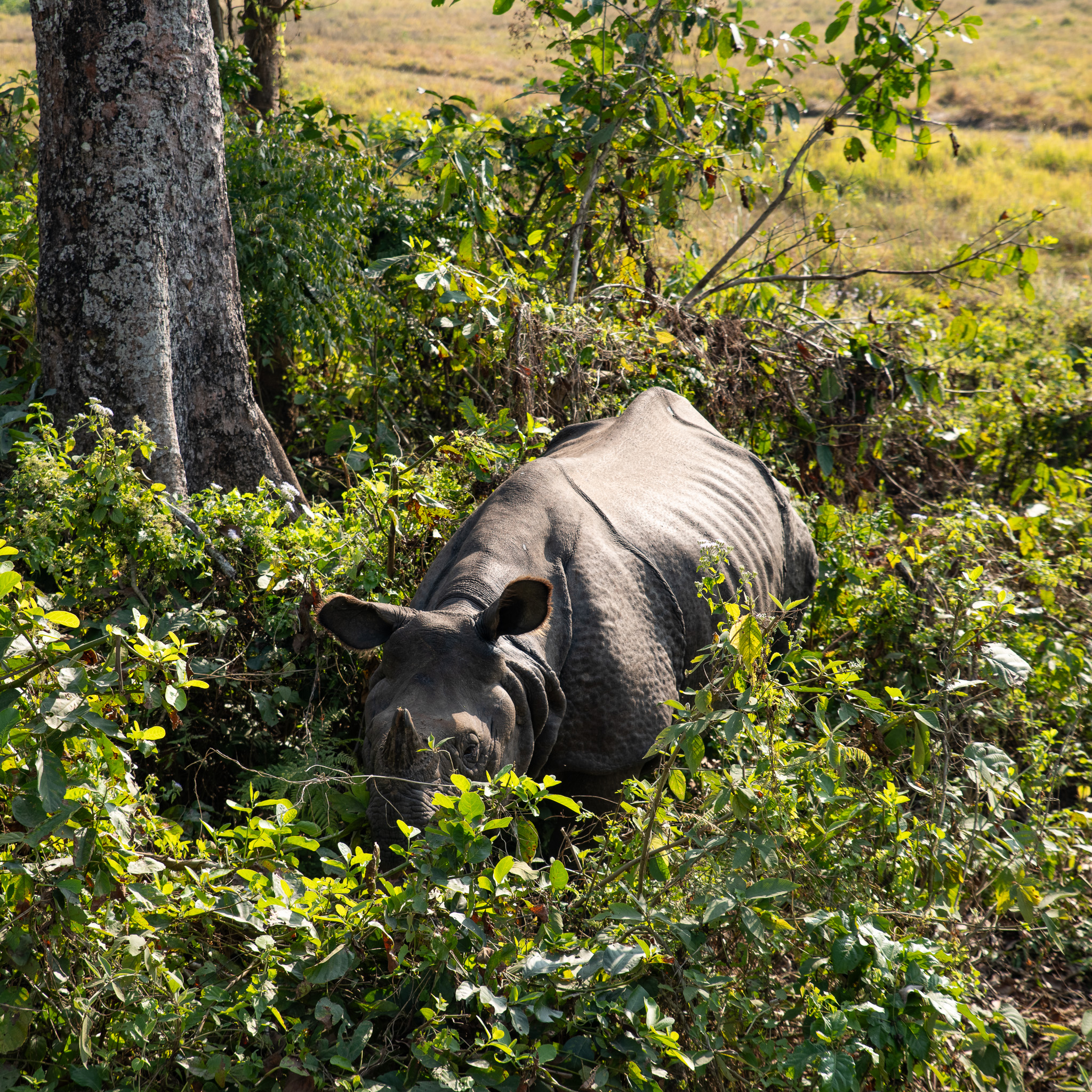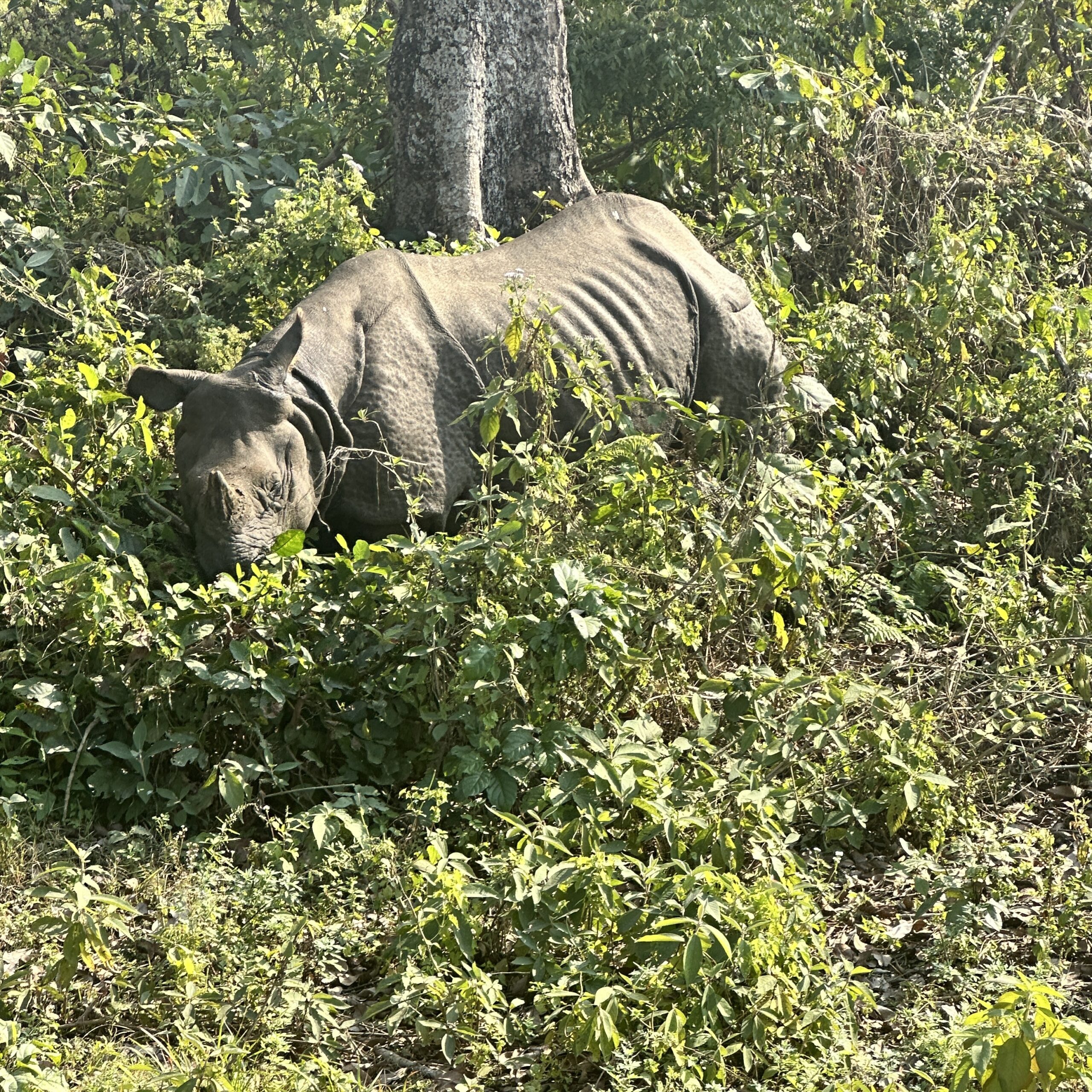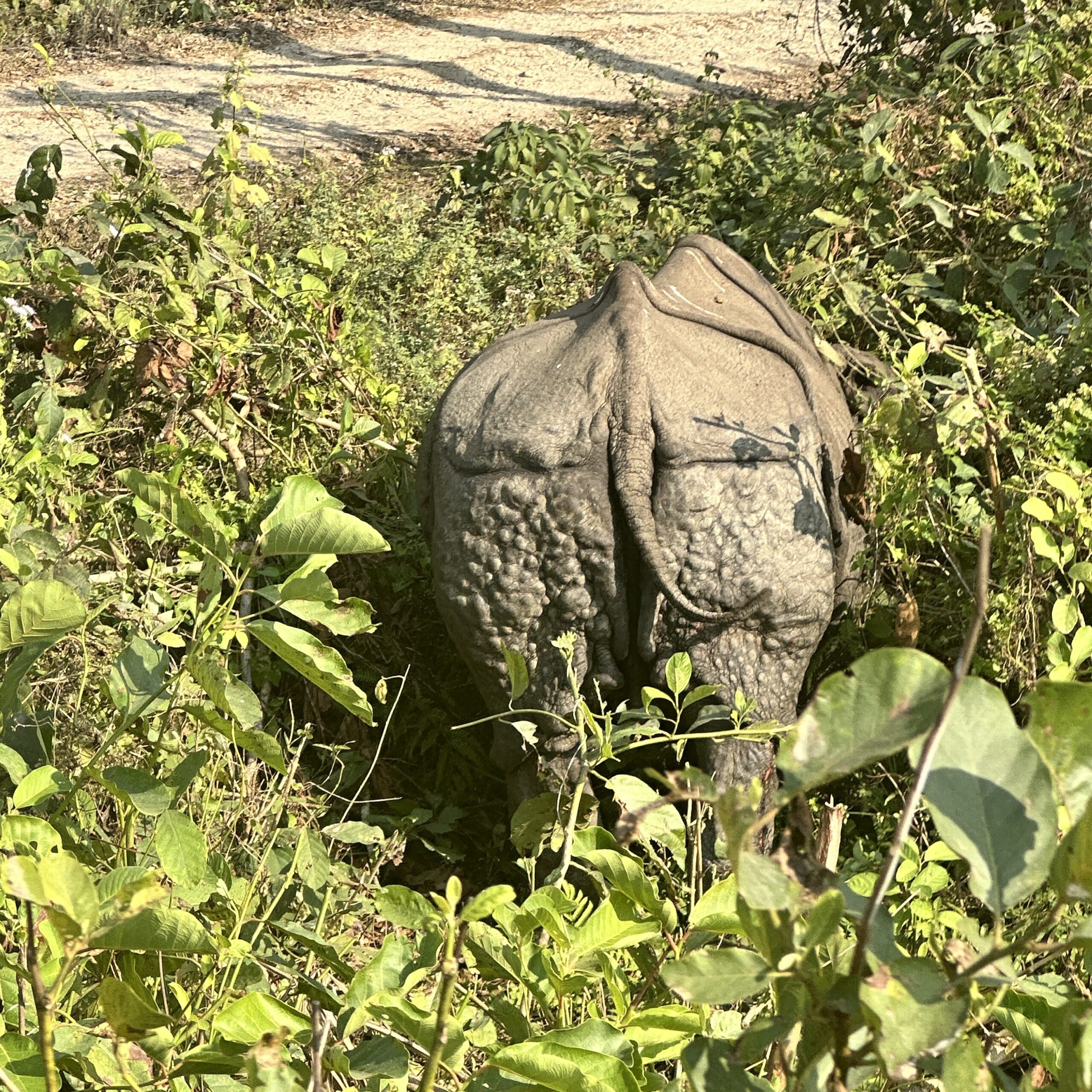 するといきなりです。オジさんが見つけたのかゾウが見つけたのか知りませんが、すぐ横の茂みの中にサイがいるのです。