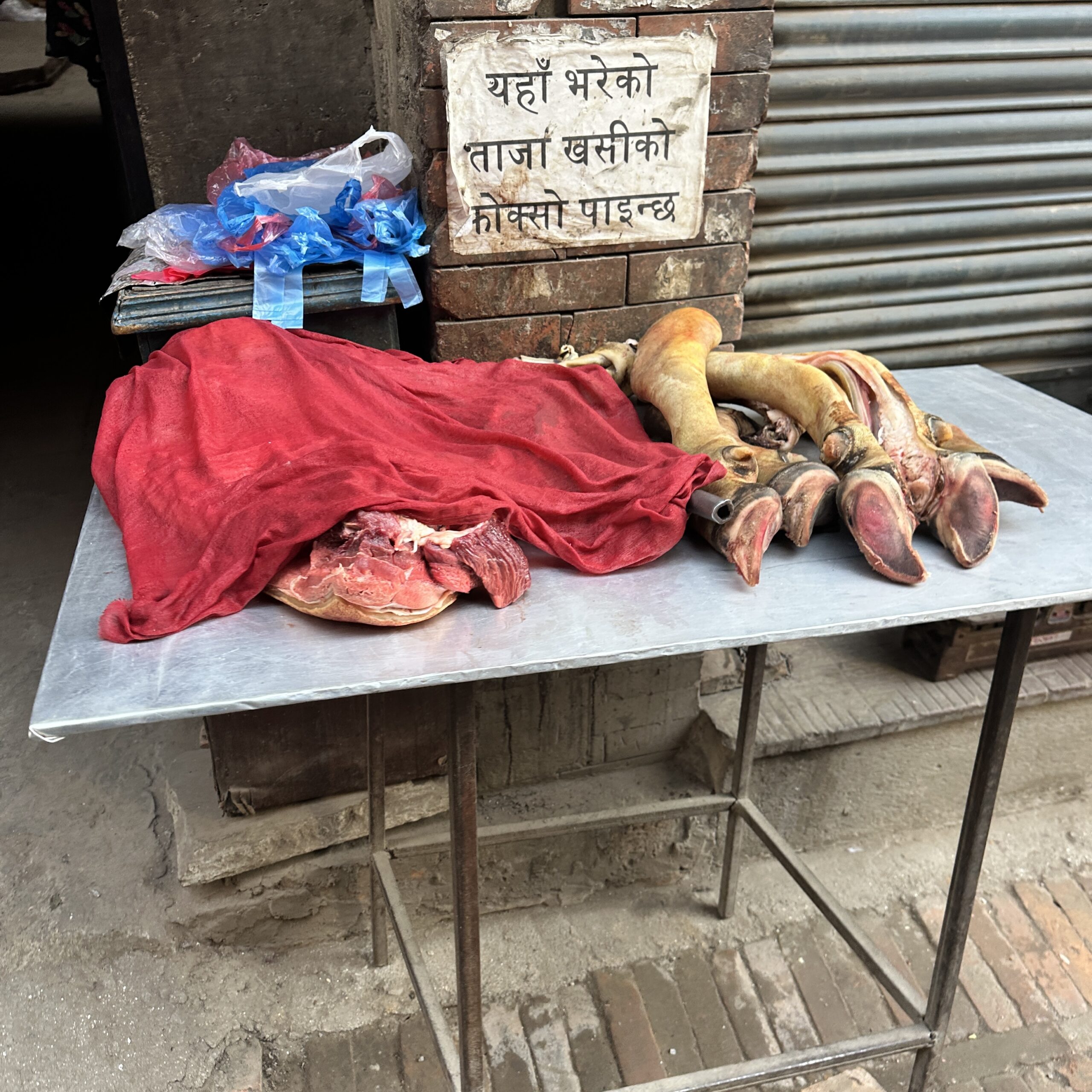 肉屋さん。水牛の足・・・これはどうするんでしょうか?スープ用??きっとヤギの肺を蒸した物でしょうね。分銅もあるので量り売りが確定ですね。シャッターも閉まっています、こんな感じで動物たちも沢山います。ネコだっていますので、本気出したら持ち去ることも可能です。どうなんでしょうかね・・・あまり売る気ないのかな?