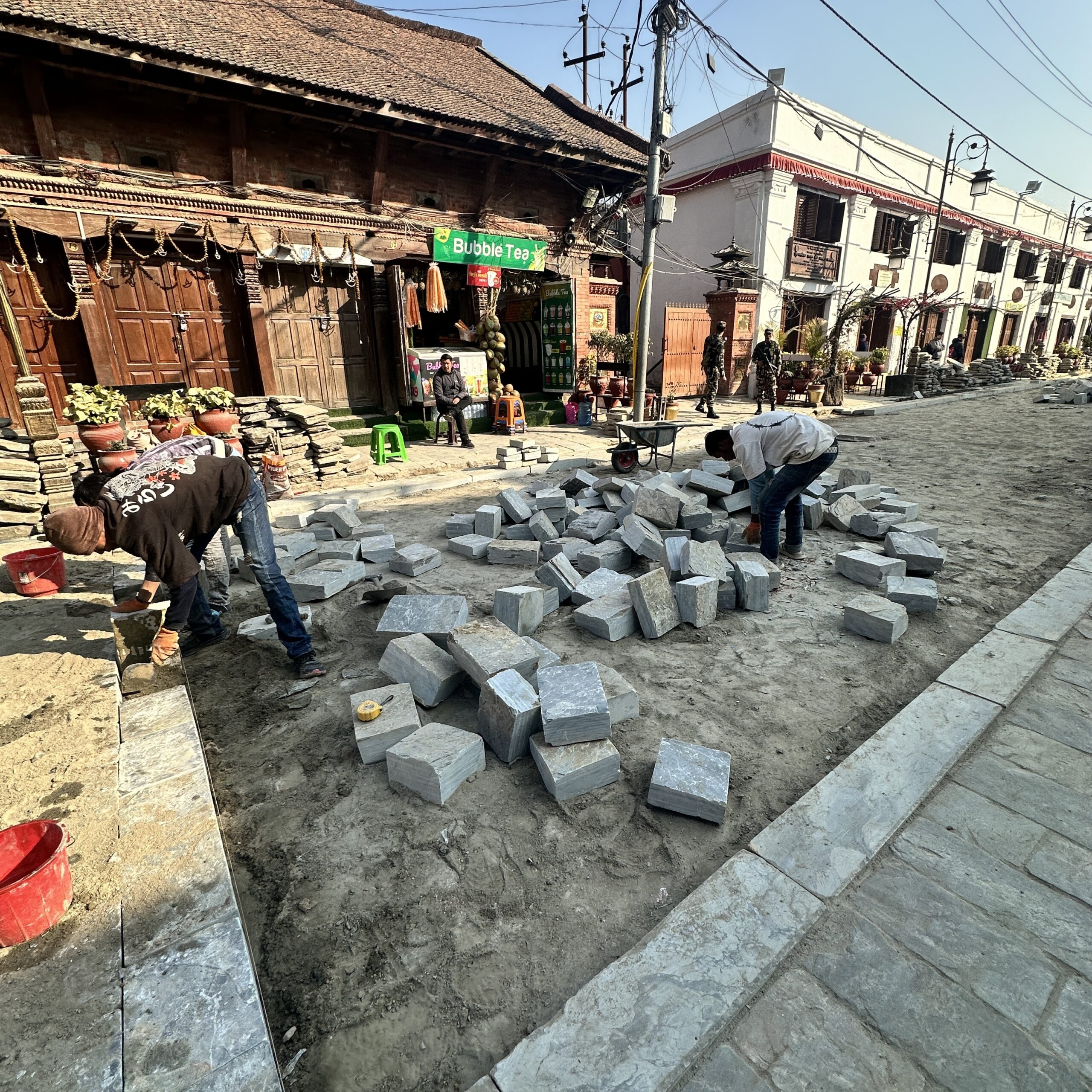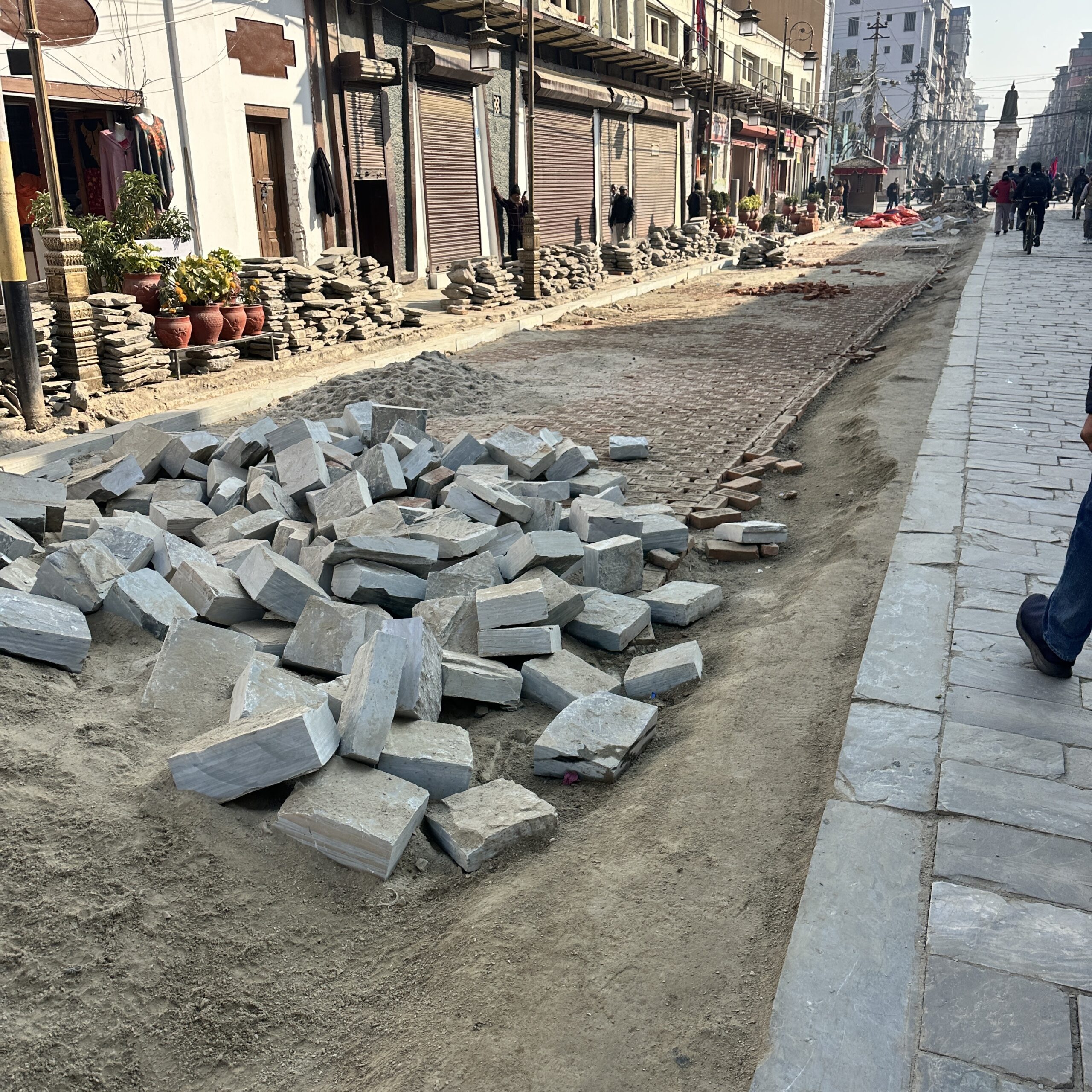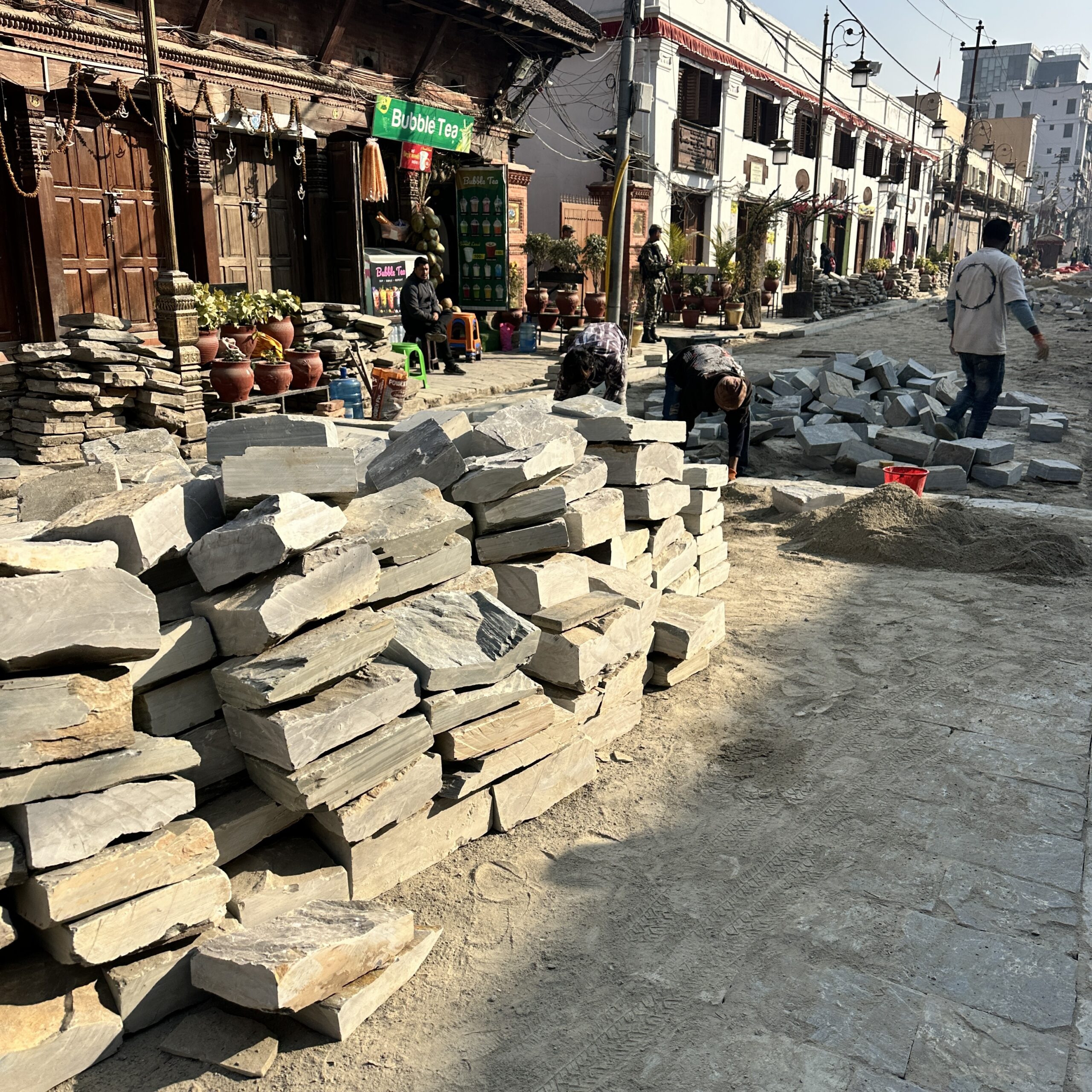 ダルバール広場チケットセンターを上手くかわして、別な出口に移動。道路の整備中でした。表面はヒマラヤ産の大理石、その下にはレンガを敷いてあるんですね。そして基本は「人力」です。なかなか大変そう・・・