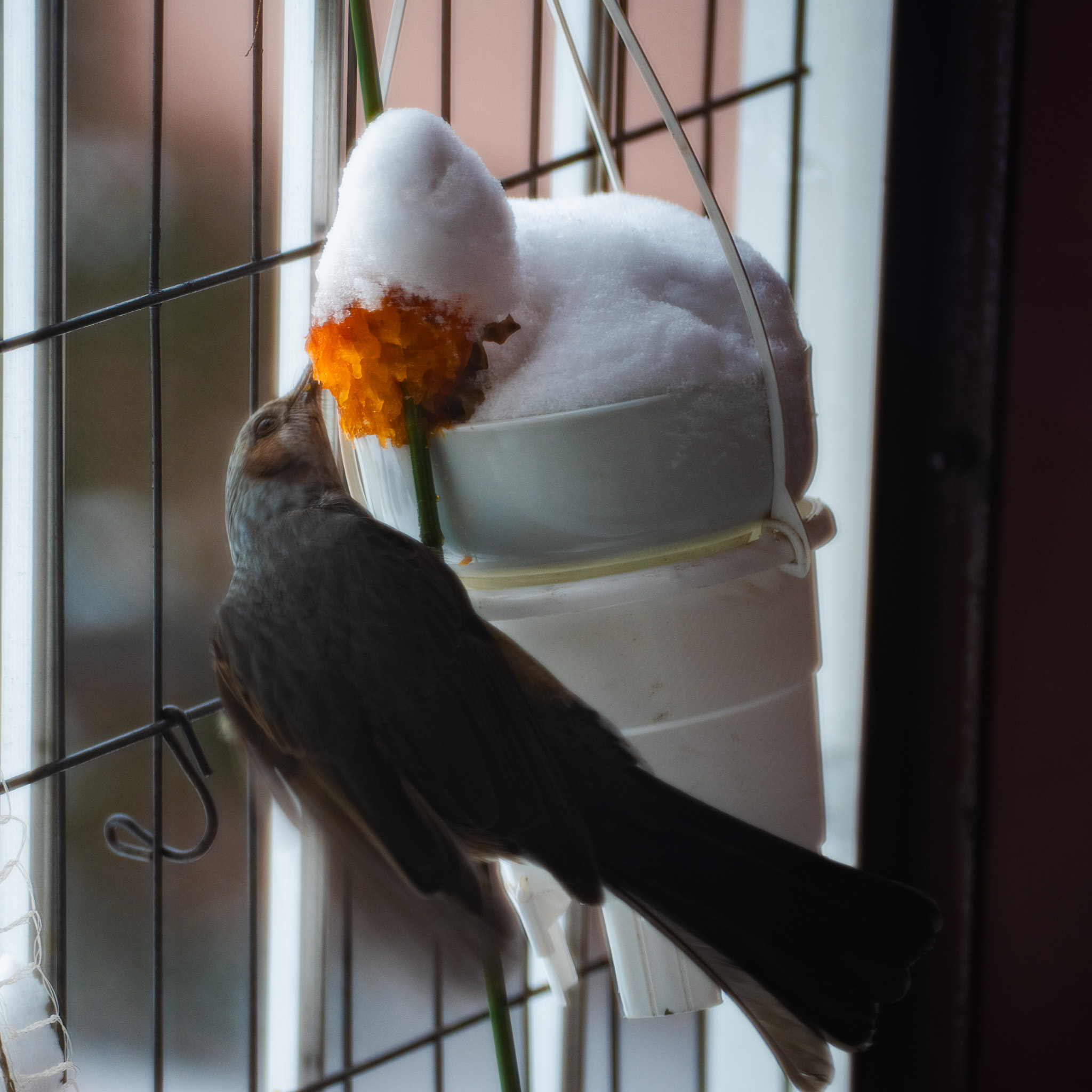 設置しましたが、昨日は残念ながら来ませんでした。柿は色的にも目立つので認知されそうですが、果たしてこのバードケーキは認知されるのか心配です。されなかったらどうしよう。まあしばらくは「気温の関係で崩壊または腐敗」はないでしょうから、様子を見ようと思います。