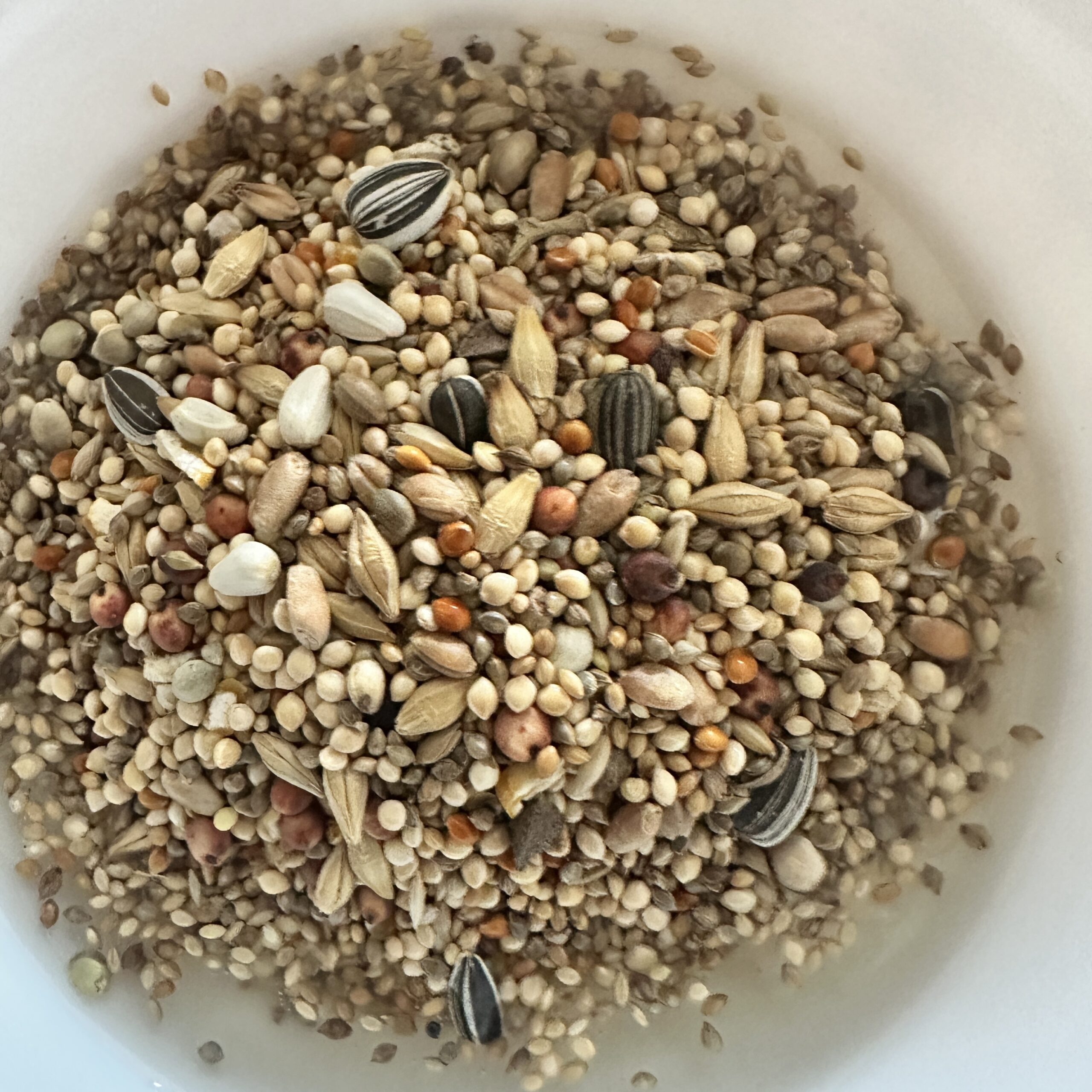 材料は「肉を買った時にただもらえる牛脂」「砂糖」「小麦粉(今回はあえての玄米粉)」「ホームセンターで購入した野鳥用の餌」です。