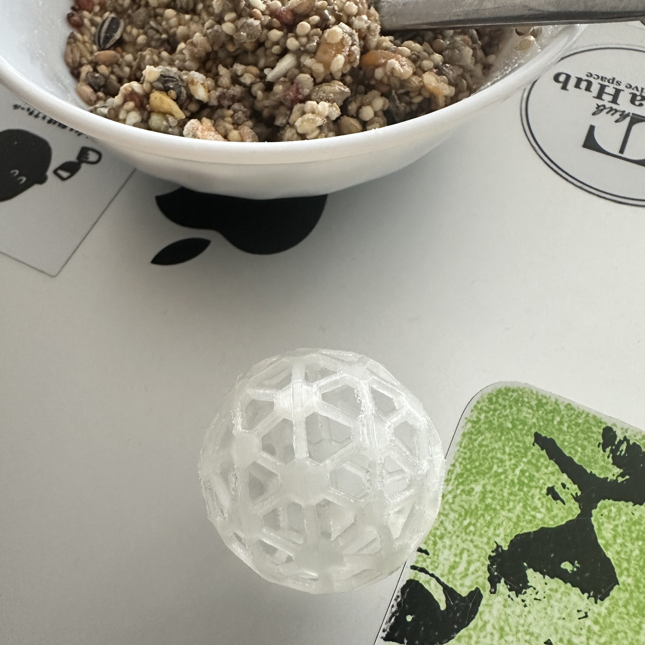 となると、中の芯材になるようなものを・・・作ればいいか。3Dプリンタで作成して紐をかけ、これにドロドロ状態の餌を貼り付けて、冷却します。固まってから外に設置すればいいというわけですね。