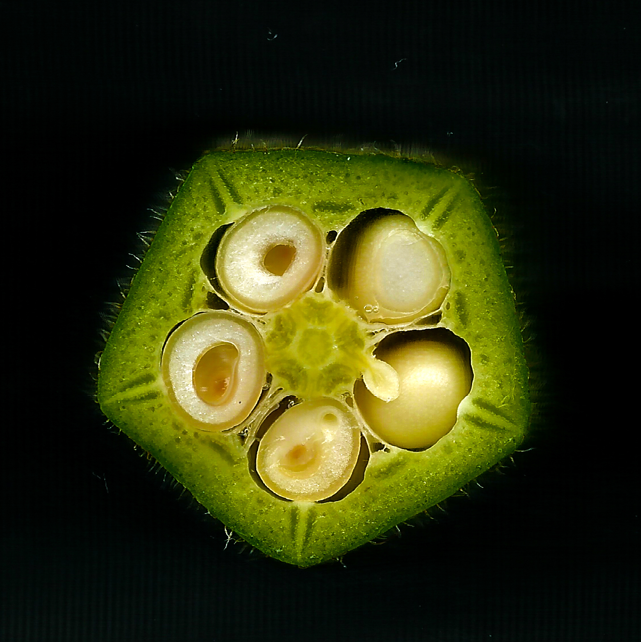 けれど断面を切ると、オクラは星形の5角形、ゴーヤは三つの部屋を持つ。