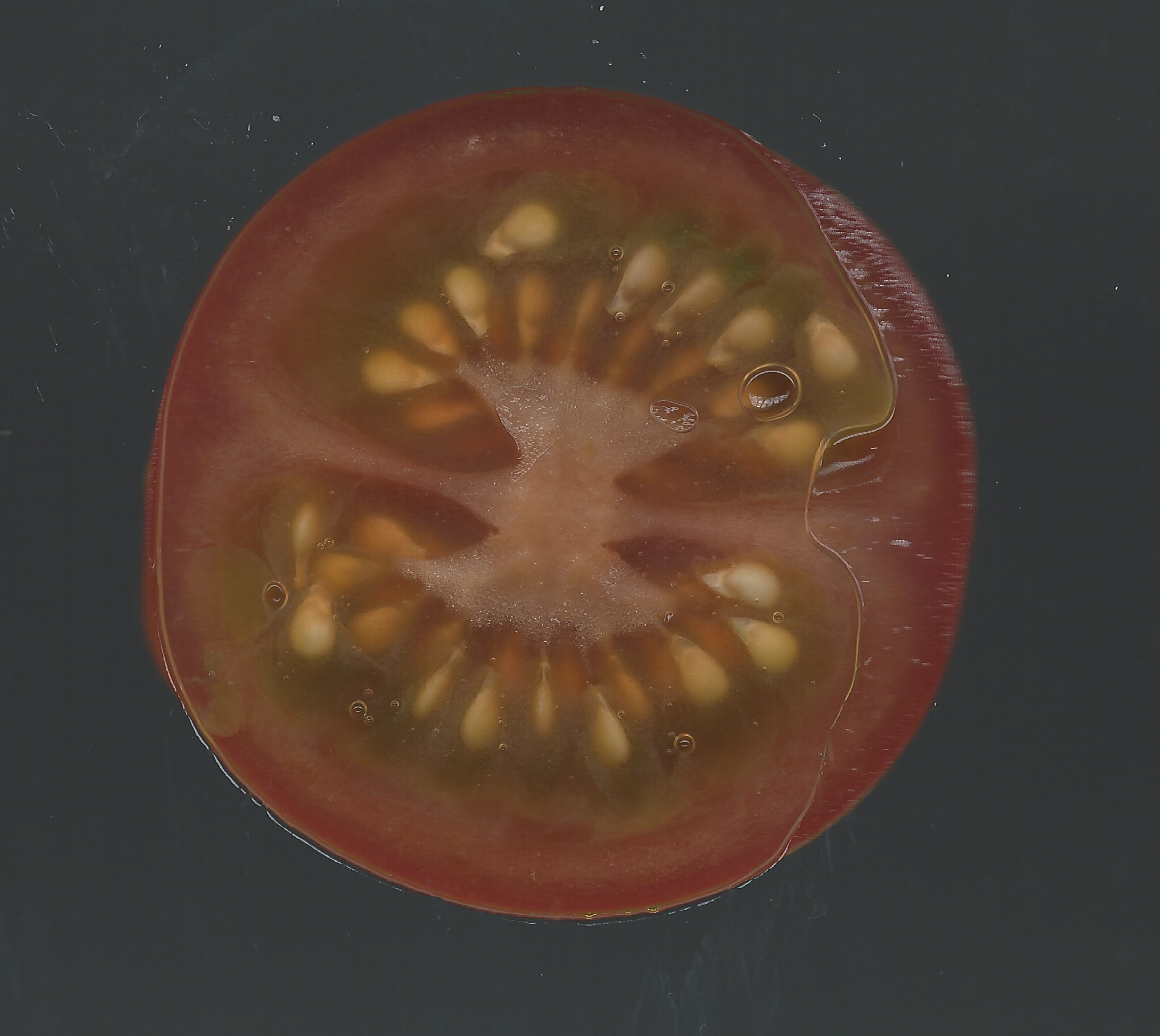 トマトを横に切ると、いくつかの部屋にゼリー状のものに包まれた種が整然と収まっている。