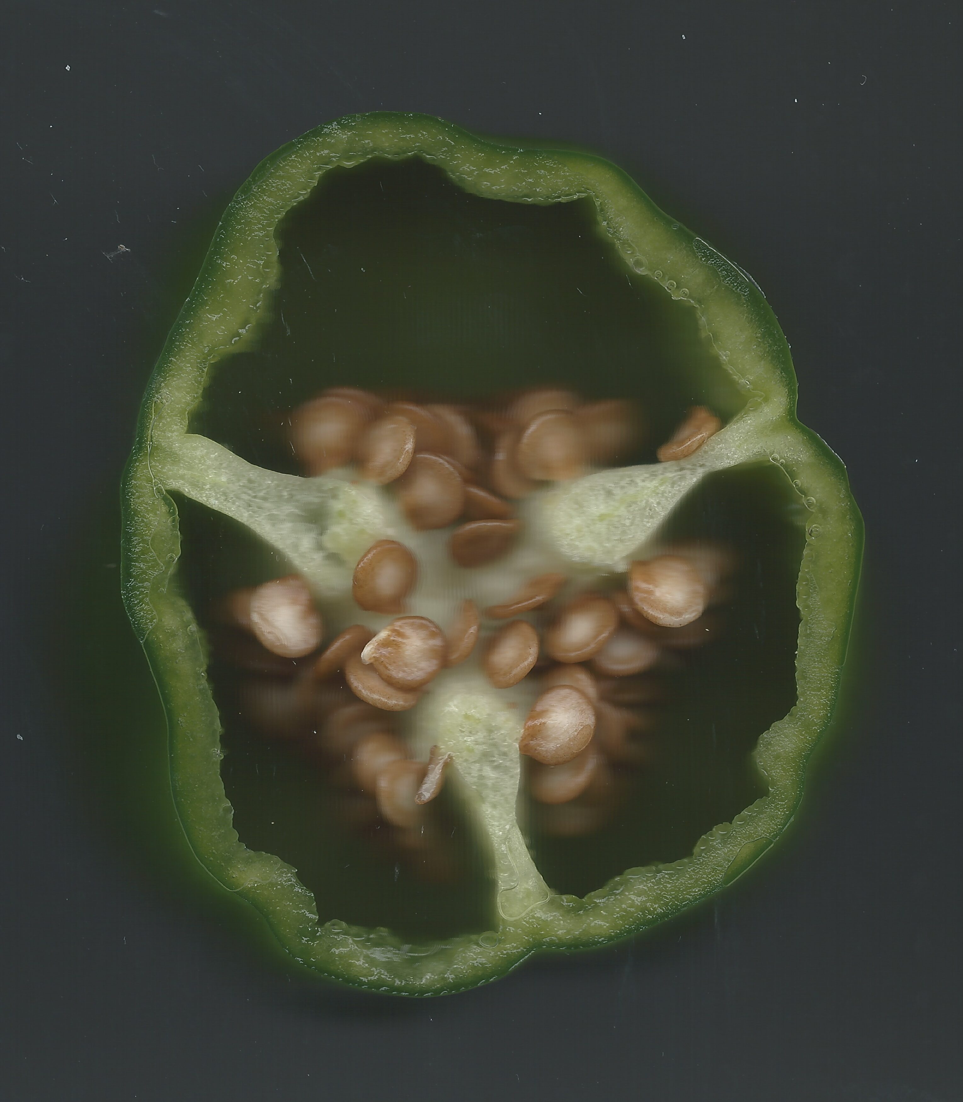 ピーマンを割れば空洞の中央に胎座が立ち上がり、キウイは小さな種が円環を描く。