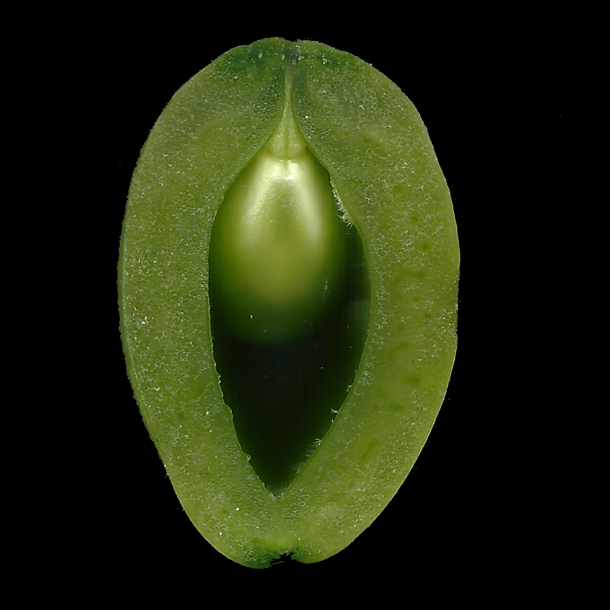 よくよく考えると、モモのあの一本の線も同じって話になる。初夏に是非みてほしいのがサクランボ。モモと同じように必ず一本線があるんですよ。豆と同じで「心皮が一枚」の良い例なのです、ただ裂けないけれど。下の写真は未熟なサクランボの断面写真です。