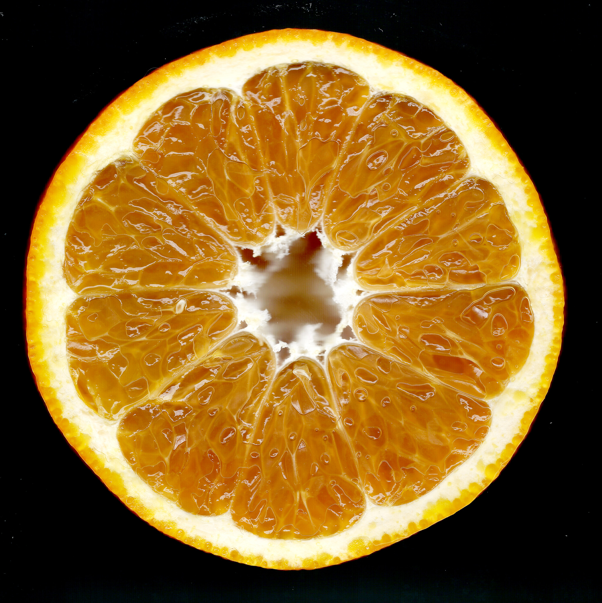 オレンジを輪切りにすると、放射状の袋が並ぶ。